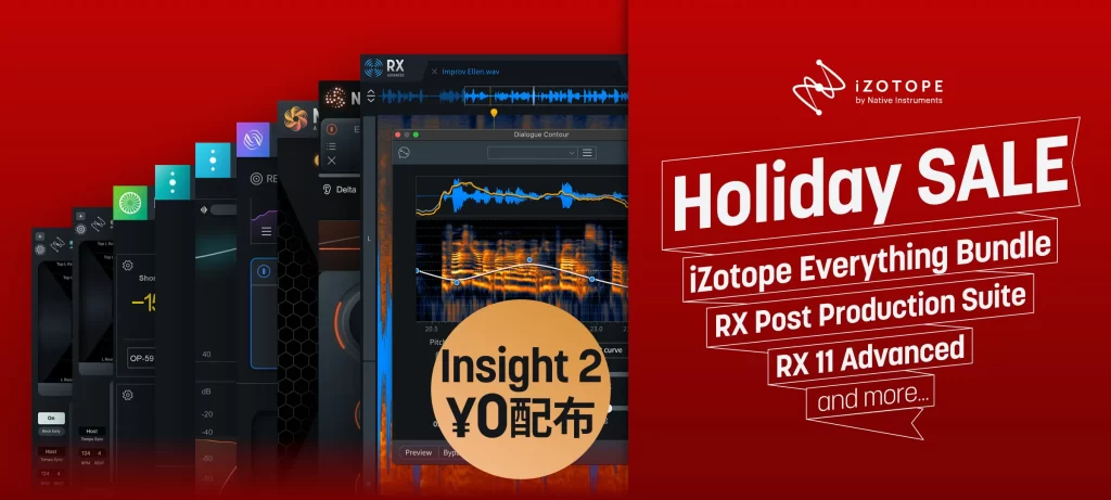 最大85%OFFのHoliday SALEがスタート。Ozone 12を含む最新iZotope Everything Bundleへのアップグレードプランが初のセール価格で登場。そのほかRX Post Production Suite 8.6やRX 11 Advanced、そしてCatalystシリーズなど各種単品対象になっています!