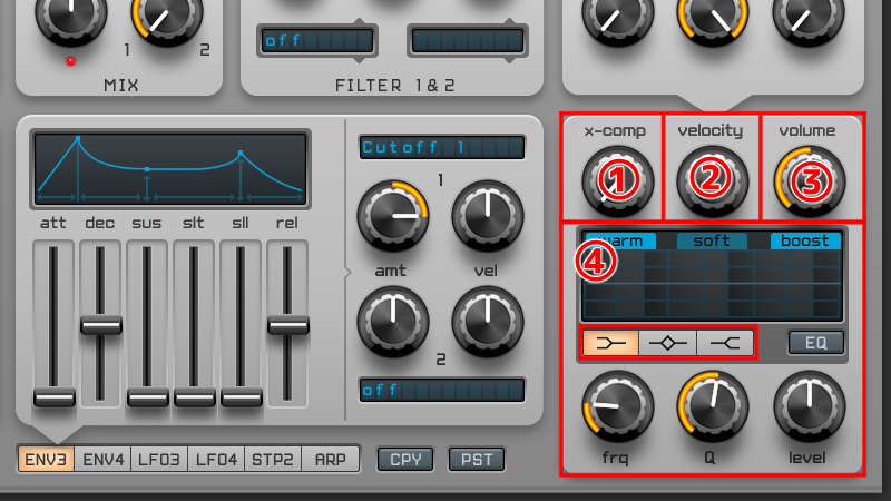- ①OSC : 最大4オシレータ使用可能。CPY/PSTでオシレータの設定をコピペ可能。