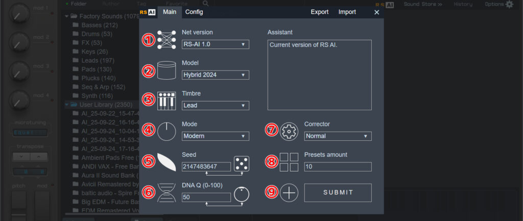 - ⑧Presets amount : 一度に生成する音色の数を選択。(最大128)