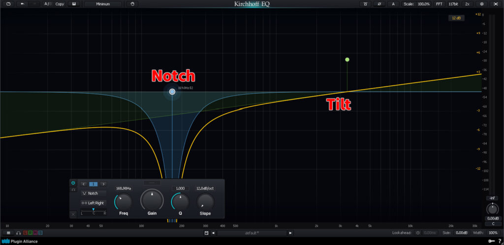 - Tilt Shelf : TiltとShelfを組み合わせ、指定周波数を境にShelfの増減が切り替わる。