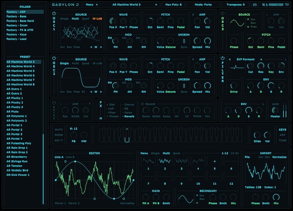 W.A. Production がリリースしたウェーブテーブル・ソフトシンセサイザーBABYLON 2!前作 “Babylon” の簡潔で使いやすい「ワンページ設計」を継承しつつ、オシレーター・モードの強化、ウェーブテーブル・エディターの追加、新フィルタータイプ/エフェクト、モジュレーション機能の拡張などを盛り込んだ最新モデル。