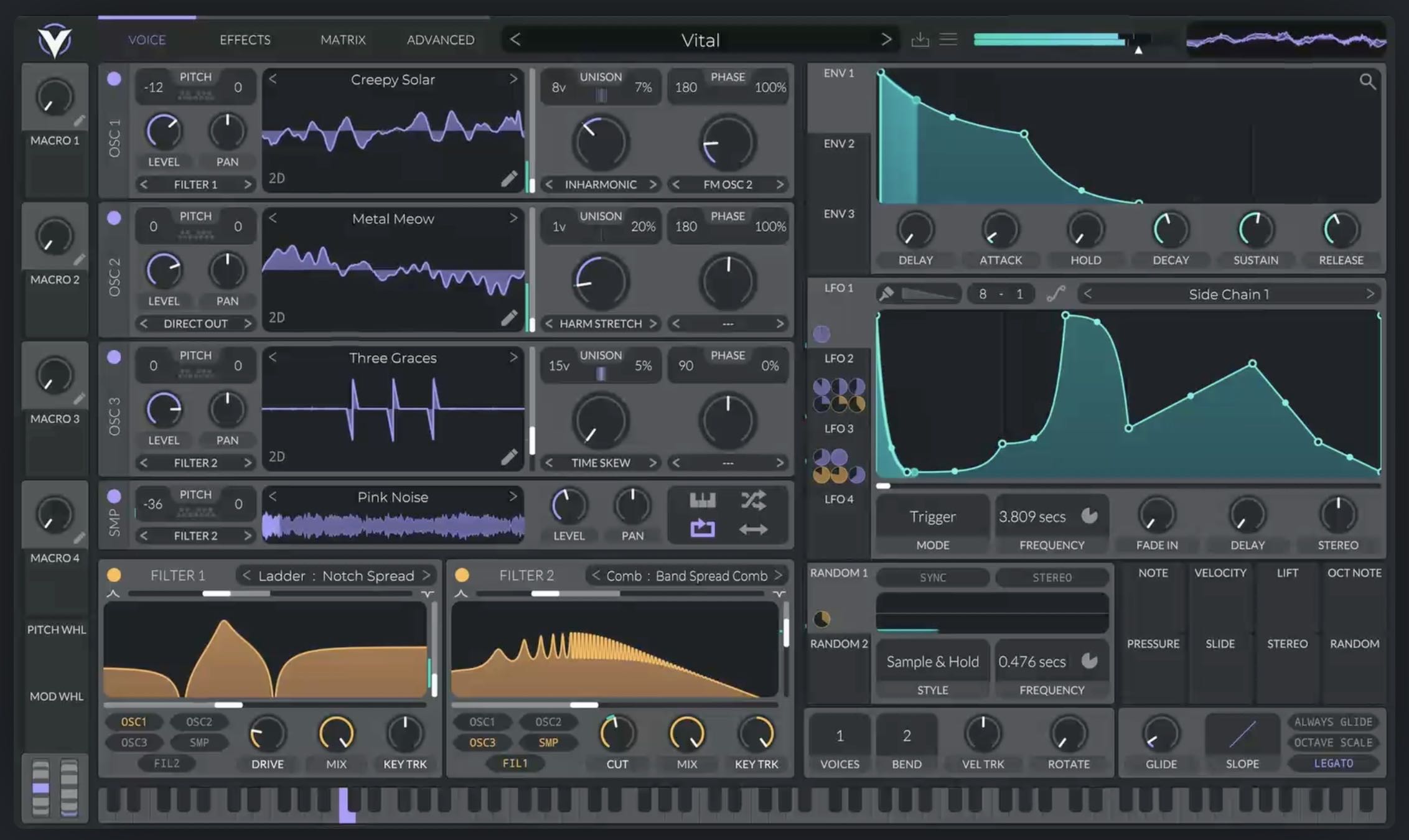 3つのウェーブテーブルオシレーター、ノイズジェネレーターを搭載